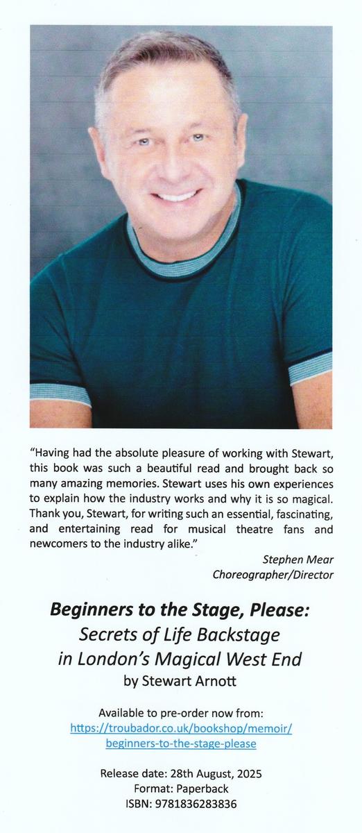 “Deliciously theatrical and utterly revealing – Stewart Arnott lifts the curtain on the backstage world with wit, heart, and more than a little sparkle. A true love letter to the magic of theatre, this book is insightful, cheeky, and full of FAB-U-LOUS tales from behind the scenes. From 𝘗𝘩𝘢𝘯𝘵𝘰𝘮 to parties, stage door to show-stopping drama, it’s a ten from me, darling!”