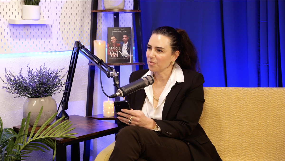 Aleksandra with Marketing Wins in the background of her podcast